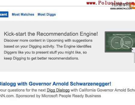此外,didg運用digg推薦引擎向用戶推薦個性化的信息,你可以看到和你一樣digg過同樣信息的人的其他digg過的信息。該推薦系統也會給你推薦一些和你有相同偏好的用戶。