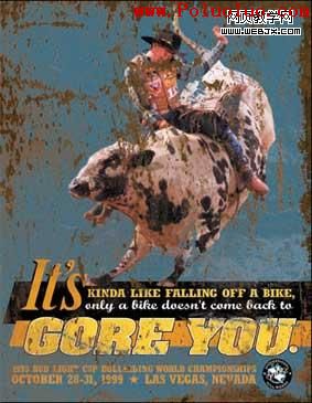 圖 8 象一些利用黃金分割原理設計的作品,二的平方根所分割的兩個矩形同樣具有焦點的作用。在上圖這張專業野牛騎手的海報設計的兩個空間中,一個放置野牛的圖片,而另一個則放置文字,與黃金分割相比,小的區域要略略小於黃金分割的小區域。