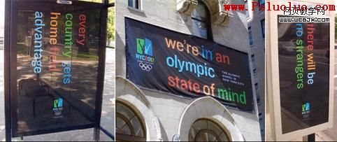 圖 10 而有關申奧的戶外廣告則純粹由文字組成。字體的顏色采用了五環的顏色,表達了一種紐約市熱切盼望能舉辦奧運會的熱情。上圖為一些由文字構成的申奧戶外廣告。