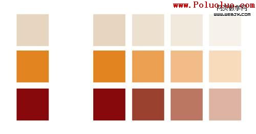 我也會代表性的只采用2-5種顏色去完善我的色彩方案。減少選擇的數目,那麼你就會在你的設計中得到一個好結果。這裡有個色彩方案的例子我將它們放在一起。就像你看見的,我采用了一個深色,一個中間調子的顏色和一個淡色。就從右邊開始,我為每一個顏色建立了一個色值范圍。這些色彩組合就像我的調色板,我會將它們運用到我的設計項目中去。一旦我有了這個調色板,我就會盡全力只用這些顏色。