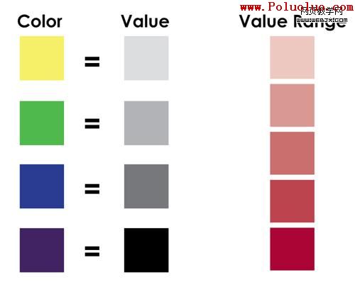 對於初學者,讓我們來說一下色值吧。一個顏色的色值就是它的亮暗程度。例如一個黃色是非常亮的顏色,紫色就是很暗的顏色。當然一個顏色可以有它的色彩值域。例如,紫色是一個使我們大多數人聯想到暗色的顏色,但是紫色也有很亮的紫色。這裡有個例子關於一些顏色和它們相關的色值。然後,你可以看到的是一個顏色的色值范圍。