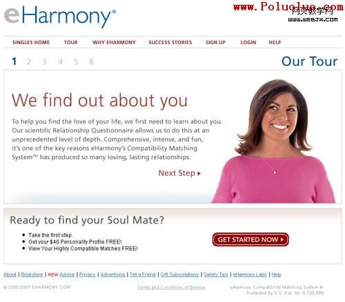 這是E-Harmony網站的頁面。他們真正目的是讓浏覽者去注冊。所以,你看什麼是這個頁面上最大、顏色最深的東西呢?是不可點擊的一個女孩的圖片和"Get Started Now"的按鈕。很明顯他們想要你點擊按鈕"Get Started Now"。"Get Started Now"按鈕的大小、顏色的深淺是跟“Next Step”按鈕相對而言的。“Next Step”按鈕讓一些繼續游覽的人去點的。但是"Get Started Now"為什麼那麼有吸引力呢?為什麼它能跳出頁面呈現在你面前?很簡單,運用對比!