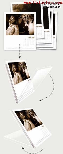在這裡,我們讓你在新的一年中,使你的桌面能夠有讓人更多回頭注視的東西——設計今年的日歷,這個象 CD 盒大小的架子能夠使你在上面擺放你設計的日歷,它翻轉過來後就可以變成一個立式的展示架,由於它兩邊都是透明的,你還可以在日歷的背面印上一些產品的宣傳資料。你在設計日歷時,可以采用單面印刷或雙面印刷。日歷在設計上必須持續保持一致,如果要在背面印上廣告,在風格上同樣要連貫。