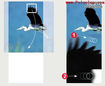 改變版面的尺寸(見上圖),在 Photoshop 裡,對翅膀的上方進行復制粘貼,將復制的部分移到下方,將它放大。( 1 )然後用一只比較軟的毛筆小心處理邊緣與背景接合的地方,使到其能夠自然地與背景融為一體。( 2 )然後用吸管工具在復制的圖片上取一種顏色,再利用松軟的筆觸將下方空白的地方填滿。
