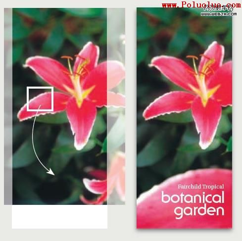 在上圖中,我們從上方截取一小塊花瓣,同樣將它移到下方角位,放大,由於花瓣上的背景比較單純,這樣就巧妙地給文字創造了一個區域。同時,紅色的花瓣與其邊緣上方的綠色形成的優美的搭配。