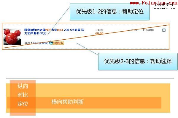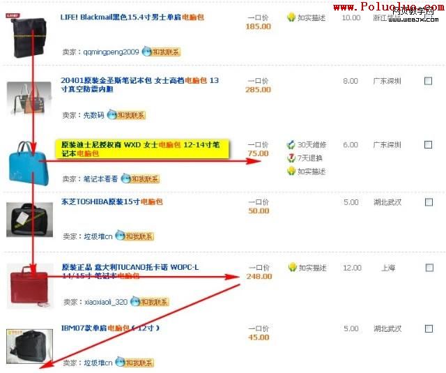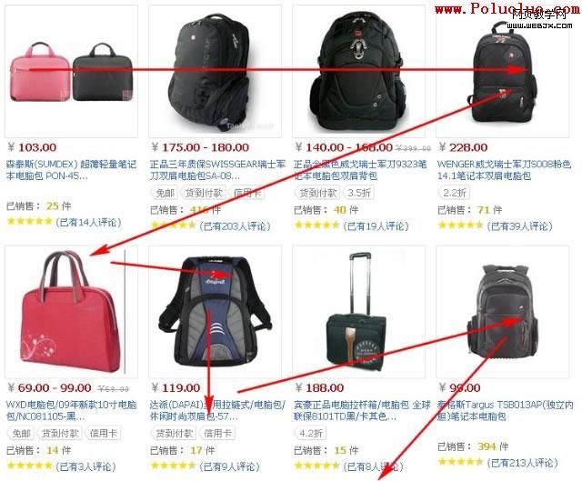 我們假設有一個同樣和我在買電腦包的人,假設他不關心顏色,不關心款式,只關心價格(很多做批發的也許是這樣的)——那麼他一來這個搜索結果頁,會不會首先從價格所在的列開始縱向浏覽,排除,選擇,橫向研究並下決策——放棄還是點擊?這是完全有可能的。