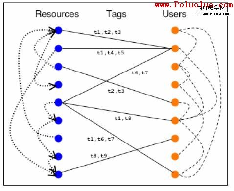 Marlow et al (2006)提出一個tagging系統模型,包括資源、tag、用戶三部分,它們的關系如圖3。