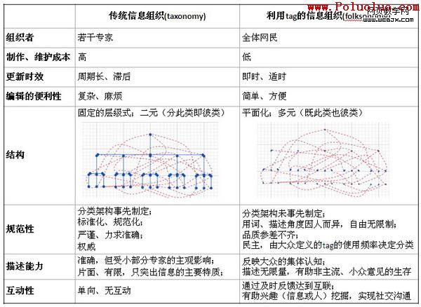 · tagging構成分眾分類法(folksonomy):分眾分類法,指大眾自發利用tag對信息進行描述、分類,構成與信息架構中傳統分類法(taxonomy)相對的信息組織。二者的區別見下表1: