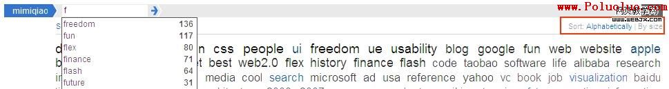 目前tag的展現方式主要有列表與雲圖兩種。列表無重點,雲圖則降低了較小字號tag被發現的效率。但無論采取哪種視圖,由於標簽的增長性較強,數量的增加相應提高尋找成本。從算法的角度,可考慮Montero et al(2006)所提出的語義聚類:根據不同tags同現的頻率將其聚合、相鄰放置。從交互的角度,應提供一種或以上排序(按字母、熱度)。具體設計案例可參考此文。
