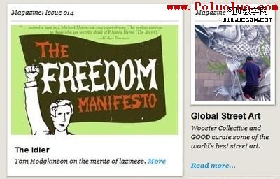 在博客類網站設計中,我們發現一個有趣的現象是很多技巧都是取自於傳統(印刷)媒體設計。包括文章的組織,頁面的排版,插圖甚至於文字的對齊方式都和傳統印刷媒體越來越接近。Grid-Based(網格化)設計方式在產品網站,博客以及個人工作室網站得到了廣泛的應用,但是在企業站點或者在線商店中還未有出現。