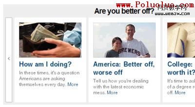 這種形式的好處是,用戶可以不用多次點擊來搜尋他們感興趣的內容,可以快速的通過滾動幻燈片來浏覽希望他們注意的內容。這種形式多用於娛樂站點,或者是一些大型博客。是一種非常吸引眼球的展示方式。
