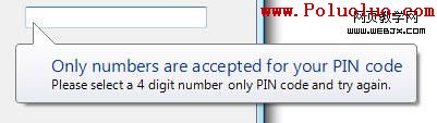 2、當用戶輸入無效字符時彈出氣球狀提示。當然,最好是沒有這樣的限制,因為這會削弱密碼的安全性。為了防止信息洩露,該氣球狀提示應當只提及那些已寫入文檔的關於有效密碼字符的信息。在下面圖4示例中,氣球狀提示指示密碼只能包含數字。
