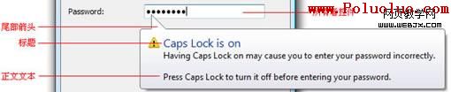 1、例如大寫鎖定鍵(Caps Lock)開啟狀態,密碼框的氣球狀提示(參見圖1)。所有者控件處於某種影響輸入的狀態,該狀態可能不是用戶所期望的,但用戶也許沒有意識到其輸入所受的影響。當出現特殊情況時(如超過最大輸入字符數或大寫鎖定被啟用等),在第一時間使用氣球狀提示進行警告可以防止用戶產生挫敗感。它在給出反饋信息的同時,不改變輸入焦點,不強迫用戶進行操作。這一點非常重要,因為這些特殊情況有可能是故意為之的。這些氣球狀提示對於密碼框尤為重要,因為用戶在密碼框中輸入時只能得到很少的反饋。此類氣球狀提示帶有警告圖標。