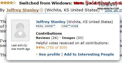 這裡觸發條件是鼠標hover時,觸發Balloons(氣球狀提示)。顯示評論者的相關信息。這裡的應用是信息提示,但卻是應用了氣球狀提示的形式。在Amazon的商品評論裡也有類似的提示,不過它不是氣球狀提示,在那裡它承載了更多的交互和文字鏈。如圖9。