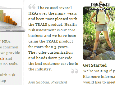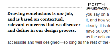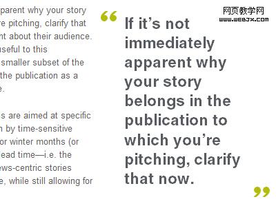 其實我們知道旁引是來自於印刷,它是用來強調一些重要的信息和采訪摘錄的。格言引用沒有被放置在內容裡,而是在旁邊。這種引用通常比較短且提供一些在文章中不能被找到的附加信息。在網頁中,這種技巧似乎用的很少,但是它有其自身的魅力,並且如果使用得當和目的正確,可能能強有力的支持內容。設計者通常使用線或者大遍空白來分離主體內容和鄰引述。