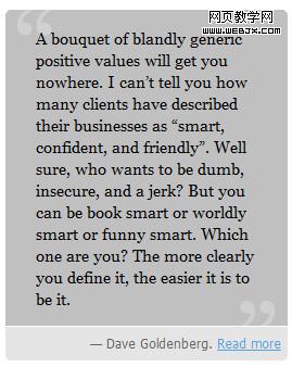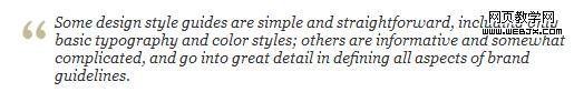 設計格言引用的另一個標准的方式是用引號本身作為一個可視化的元素來清晰的表明文字段落是被用來支持什麼的。這個方式是目前最流行的一個,在它的後面有一個好的原因:它毫不含糊的傳達文字塊的意思。令人驚訝的是,引號幾乎總是放置在引述的左邊。你可以嘗試一下將引號放置在右邊的感覺,或者放在下面。