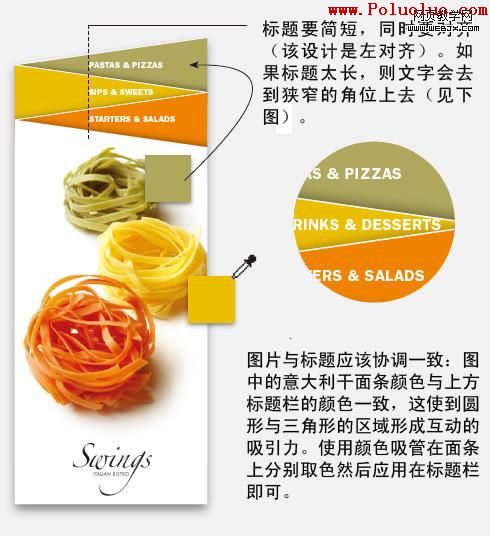 將封面的顏色及形狀植入內頁:在上述版面中,圓形及三角形呈現一種幾何的對比關系。在這裡,關鍵是要保持一致。留意上方四個碟子——相同的觀察角度,相同的尺寸,沒有其它背景。如果你打破了這種一致性,都會造成一地雞毛的混亂局面。