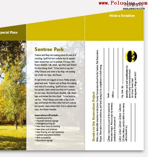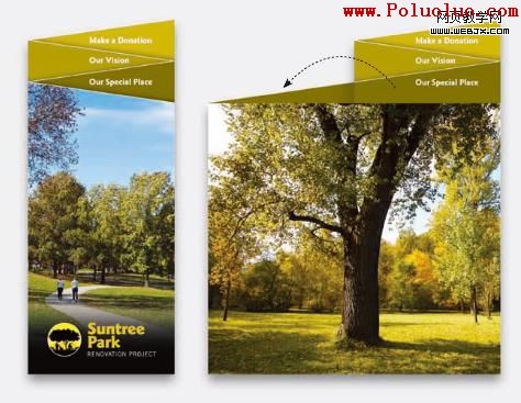 這是一張關於公園的直郵廣告,對於郵寄的宣傳單張,必須立即能夠吸引別人的注意力。上圖中,圖片承擔著最主要的作用,留意說明文字後還有隱約可見的圖片。而下方的小圖中,是另一種設計風格,與第一種對比可以說是剛好相反,因為這是一種主要以文字而不是圖片作為引導的設計(雖然圖片仍然為視覺焦點)。留意這兩個單張的設計都有一個共同點:即將其中兩個折頁都作為一個元素來處理。兩種設計都OK,設計從來就沒有自古華山一條路的說法。