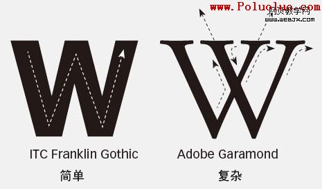 三角形與圓形構成了一種清晰簡潔的版式,所以你也需要一種簡潔的字體來搭配,我們建議(當然,不是絕對)使用非襯線體,在這個案例中,我們使用Franklin Gothic字體,為什麼說這種字體是簡潔的呢?我們可以從上面的W找到答案。Franklin Gothic字體的W都是由直線構成,而且線條寬度都相同,沒有任何裝飾元素。為了對比觀察,我們可以看看旁邊的Adobe Garamond字體,這種字體無疑是非常漂亮的一種字體,但太復雜,交叉的線條,復雜的襯線,線條寬度也不一樣,有很多精心雕鑿的細節,襯線與線條之間的弧形轉角位,都構成了一種復雜的視覺關系。