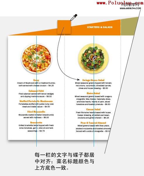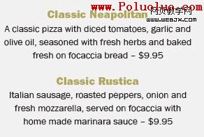 上方所有文字都是采用Franklin Gothic字體,標題使用粗黑體,正文使用正體,標題文字比下方文字要大2個Pt,而兩組菜名之間相隔一行。對於菜單來說,價錢象上圖加在文字中比單獨成一塊感覺更好——使人更專注於各種菜肴的特色而不是價錢。