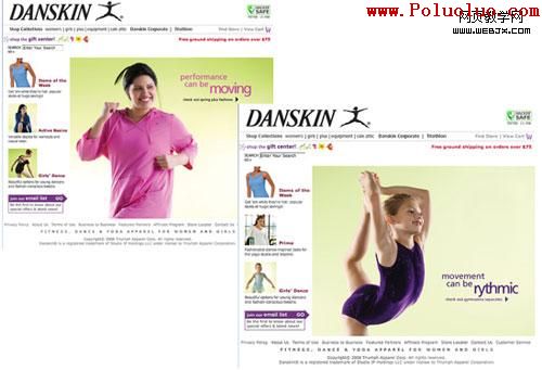 對於不同類型的訪客,你同樣可以使用不同的主頁設計。這個主意來自Danskin,左側的圖片是搜索包含“加大號”關鍵詞的網頁,右側是搜索“藝術體操”和“體操”、“緊身衣”等出現的頁面。