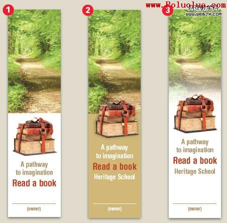 我們現在要應用第二張圖片了(那疊書的圖片),而文字可以使不同樣式、顏色形成對比。而且第二張圖片還可以遮住圖片的切邊,同時又能傳達出這張書簽的第二個信息。