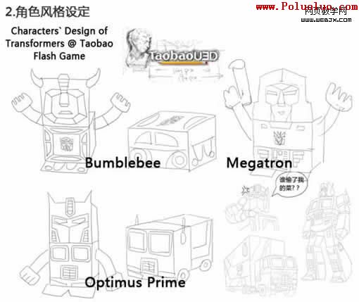 整個動畫的創意制定到最終動畫+音效完成,我們只有七個自然天左右的時間,因此在角色的制定中,我們用最簡單的風格來繪畫幾個標志性的變形金剛人物。另外,以往設計中已經制作好的一些素材也成為我們動畫場景中必不可少的道具。