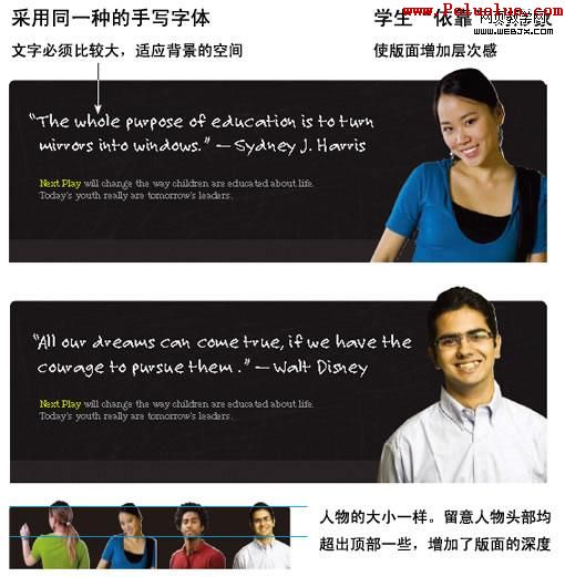 這個黑板樣式的橫幅出現在每一個頁面中,但每一頁都有不同的學生及信息,而全部加起來,則傳達了一種強有力的個性及共性。