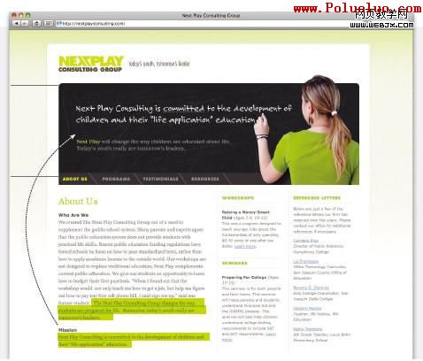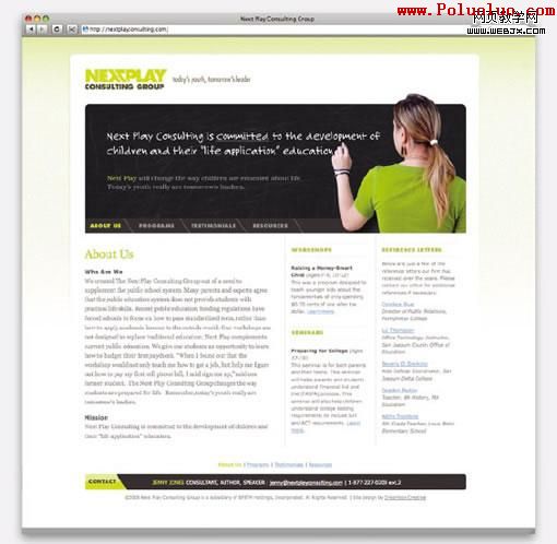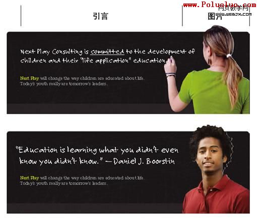 黑板樣式的網頁橫幅是一個強有力的視覺元素,我們對黑板的視覺聯系都非常熟悉,畢竟我們都曾經無數次看著它度過我們的青春。黑板本身就具有尺寸大、醒目(黑白強烈對比)的視覺特性,而且,它還放在最上面。在這個背景中,NEXT PLAY用文字及圖片向觀眾作介紹。一個學生拿著粉筆明確無誤地給人一種教室的感覺,而且上面這一句關於機構的“我們是誰”及“我們是做什麼的”從下方正文中抽離出來被單獨放在上面,可想而知,如果僅是出現在下方的正文中,它只會淹沒在文字中。
