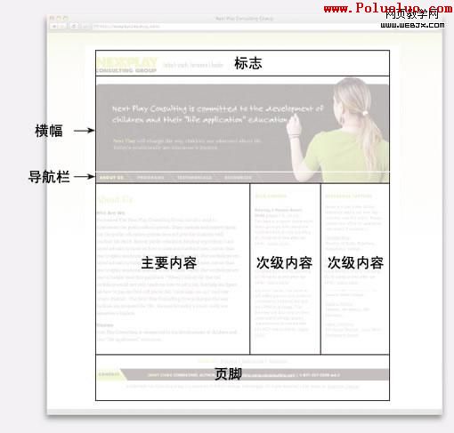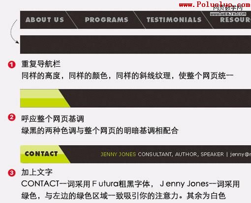 延續:我們已經將頁面的主要元素及框架弄好,是時候增加細節了。我們要借用一下標志來幫助考慮細節的問題。因為標志比網頁具有更持久的特性,我們要利用到標志的字體、顏色及其細節來設計網頁的其余部分。