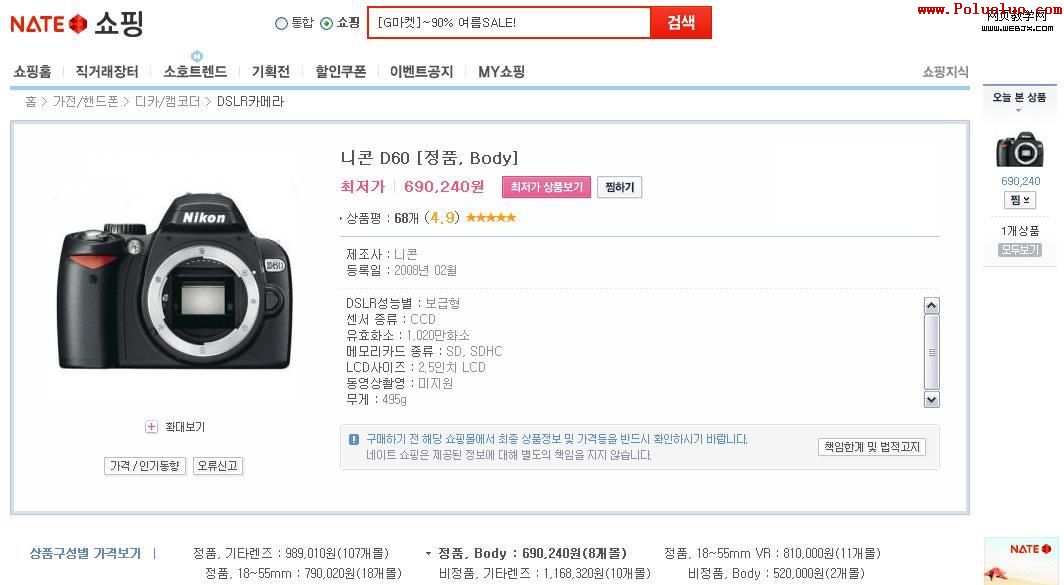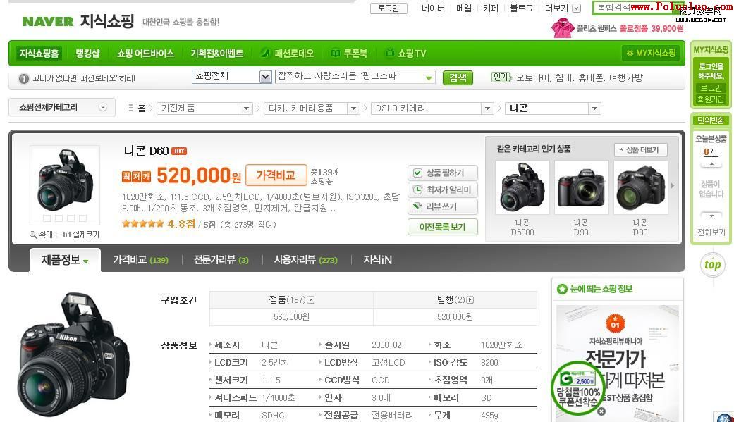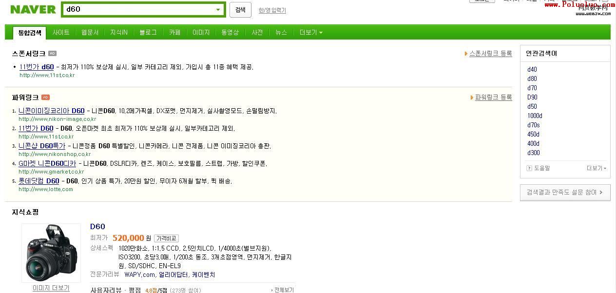 NAVER的搜索結果前6條裡有4條是購物網站的:11ST;尼康官方網店;GMARKET和樂天(SEM),下面是D60比價的入口