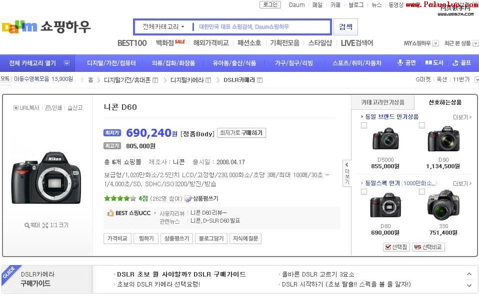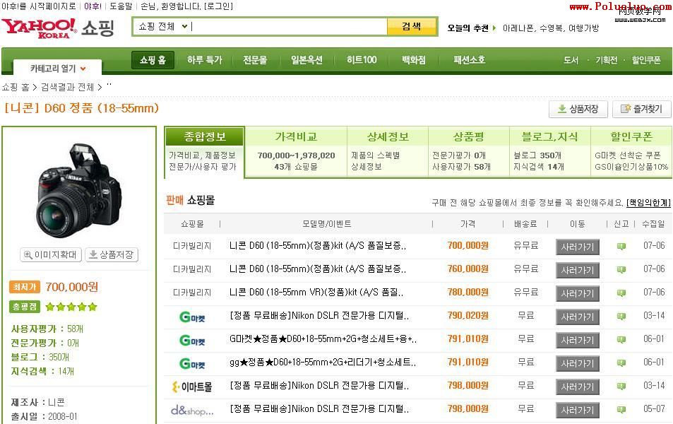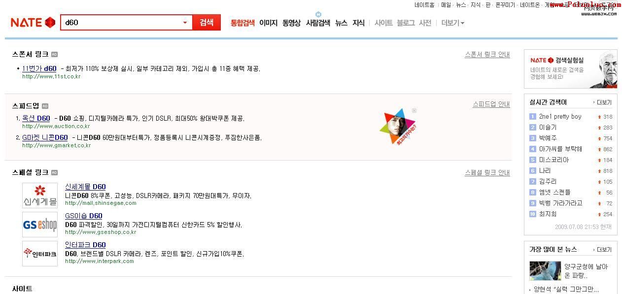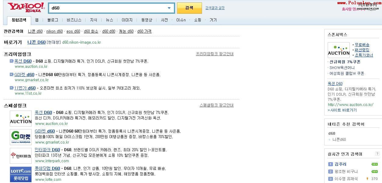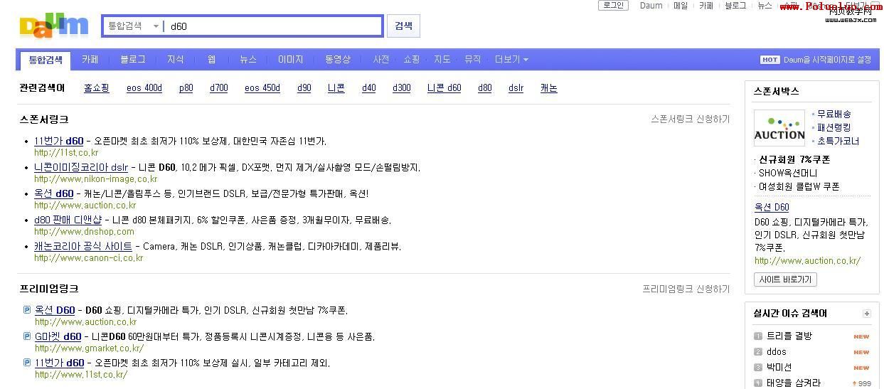 韓國的搜索引擎的搜索結果頁面是按新聞/內容/討論/購物分類的,比如在這幾家門戶搜索“尼康D60”就會呈現: