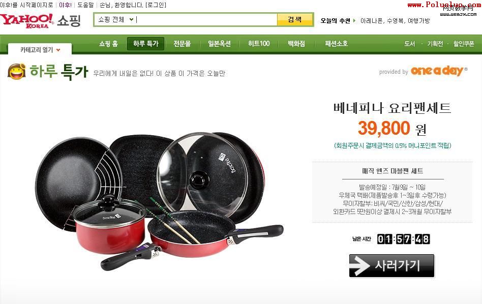 YAHOO:首頁左下和右上的BANNER是C2C GMARKET的廣告,搜索按鈕旁的LOGO在展示ONE A DAY今天的商品,ONE A DAY是個每天只賣一件稀奇古怪的便宜商品的B2C,很有意思,每天獨立IP超過10萬,看來YAHOO貢獻不少流量,右下方是網購商品展示區(CPC)