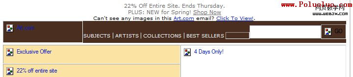 對導航條的另一個考慮,是用圖像還是HTML文本建立。只要可能,我們推薦利用HTML文本做導航條。這麼做,可以保證即便在浏覽者屏蔽圖像時,你的鏈接仍然會能被閱讀。默認情況下,大約有一半消費者在其主要的收件箱中屏蔽圖像,讓你的導航條保證能顯示,對郵件效果的最大化很有影響,尤其是在你的導航條不需要異域風情的字體、圖片或標志的情況下。