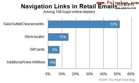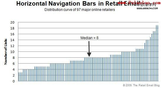 有趣的是,在導航條中含有9個或更多鏈接的零售商中,有59%是復制了網站的導航條,而那些郵件導航條鏈接更少的零售商,更多地使用郵件特定的導航條。復制網站導航,也許是受了來自銷售區經理和推銷商的壓力,但這些更長的導航條削弱了更好的效果。