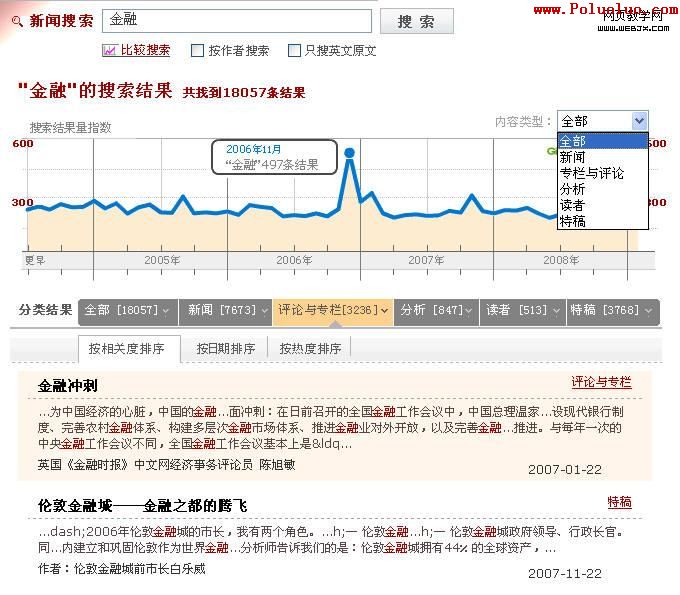 新聞類搜索還有一個高級應用,就是新聞關鍵字的趨勢比較。一般網站可能沒有這個開發實力和預算,只有成熟的SaaS才有可能提供類似的高級應用。