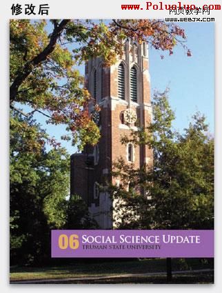 設計師有三張照片,但如果在版面上都用上這些照片,那你還要對這三張照片進行剪切,然後將它們擠進版面裡。但出來的效果卻是,這三張照片在版面中的樣式很相似(相似的圖片元素及圖案),文字閱讀起來很費力。所以,設計師又不得不將字體變得很粗,字體變粗後,又要找個地方放置學校的名字,所以在最下方設計師又加上一個紫色區域來突出學校名稱。設計師越“設計”,封面就越虛弱。無論是學校信息還是所要傳達的文字信息都在這些復雜的、太多人工痕跡的元素中消失得一干二淨。封面可以說是成為“被侮辱及被損害”的對象。為什麼會這樣?因為設計師做過頭了!解決辦法:只讓一張圖片來說話!