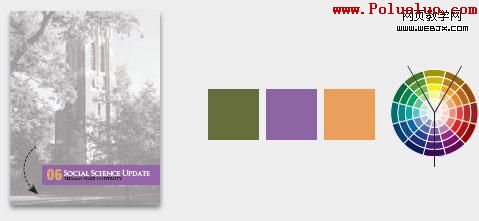 記住,在設計中,小即是多。學校的塔樓已經可以傳達很多信息。簡單的居中設計,就是直接讓這張照片“說話”,然後加上文字就行了。注意在上圖中,文字的背景區域並沒有橫跨整個版面,因為我們要讓圖片由上至下都可以流動。而上圖右,學校的主色(紫色)及褐色與樹的綠色形成吸引人的視覺效果,留意這三種顏色在色輪中的位置關系,綠色及褐色是紫色的補色的鄰近色,聽起來很復雜?紫色的補色是色輪中相隔 180 度的草綠色,而草綠色的兩邊鄰近色就是綠色及褐色(留意色輪中的線條)。我們將這種顏色關系稱之為“補色分割”( Split complementary )。
