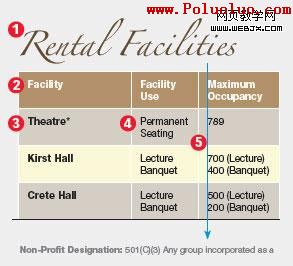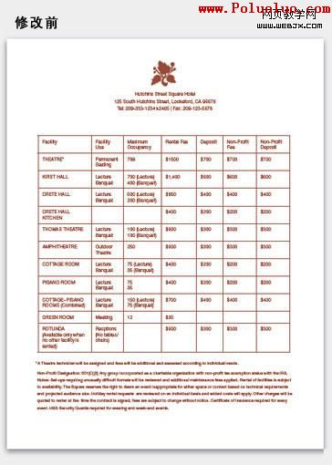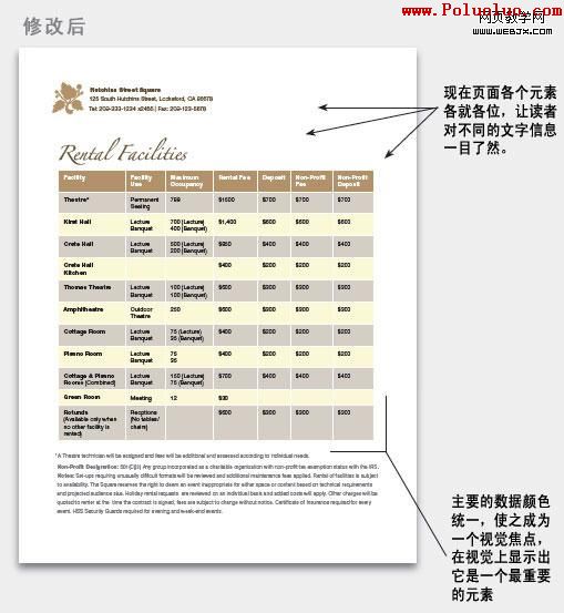 哈欽斯大街廣場酒店( Hutchins Street Square Hotel )是舉行會議、宴會、接待及其它活動的理想場所,但如果你只是看它的這張價格宣傳單張,沒有人會覺得這家酒店有什麼優點。它的版面缺乏生氣,字裡上的文字同一種字體,同一種尺寸,同一種的樣式,同一種顏色,但都迷失在白色的海洋中——雖然頁裡上寫滿信息,但毫無生命力。