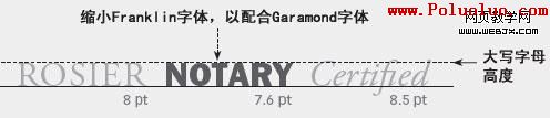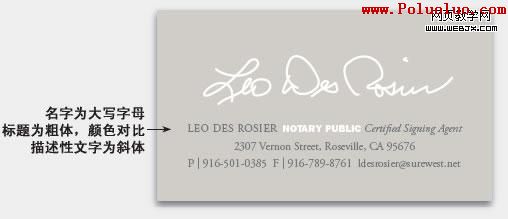 字體調整:我們可以通過對字體進行恰當的調整及選擇來加強設計。在這個例子中,經典的 Adobe Garamond 傳達了一種久遠、傳統及權威的感覺,而粗壯的 Franklin Gothic 粗體加強視覺的傳達效果。因為上述這些都是差別很大的字體,所以為了使它們在一起能夠協調配合,我們需要對個別字體進行調整。在這個例子中,我們將 Franklin 縮小一些。留意在上圖名片中,白色的標題放在灰色區域中,顯得特立獨行。