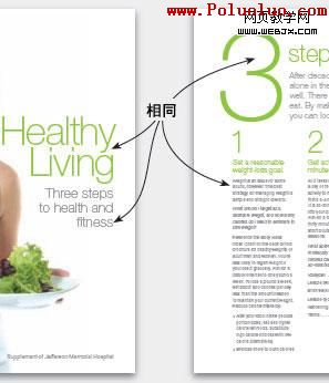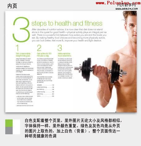 要使設計的內部與外部有著相同的風格需要一定的技巧。怎麼做?簡單,將封面的字體、顏色、圖片風格及主要的版式都搬到裡面去。注意各種元素的比例,如綠色的使用比例及圖片的大小,具體看一下效果: