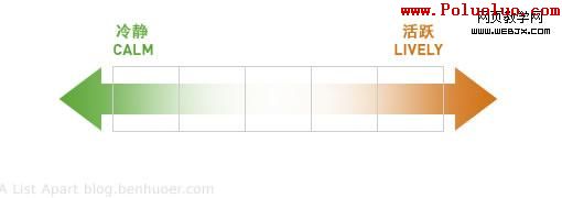 有了特征尺度,設計師就能切實體會到網站內容究竟該向用戶提供何種感受。如果設計師關於“活躍”的想法太強烈,有了“冷靜vs活躍”的標尺,就能很容易地確定他的“強烈”程度,然後再做適度的調整。由是產生的批判,遠比僅僅一句“太強烈了”更加有建設性。