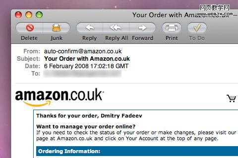 亞馬遜網站會在用戶付款後,發送關於購買的商品詳細信息的郵件,並告訴用戶如果買錯,如何在商品發貨前修改。