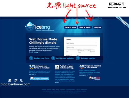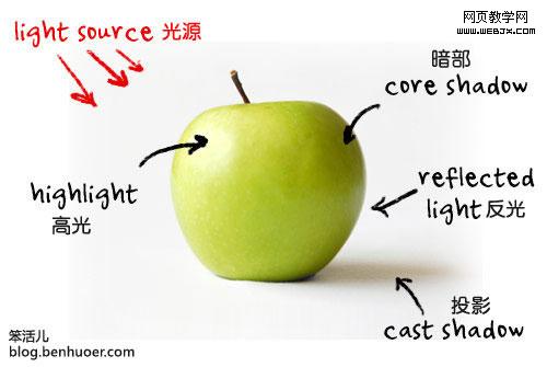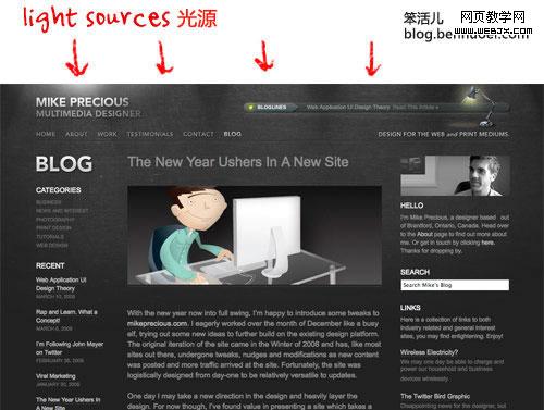 應該說利用光照時了解光源在那裡是最為重要的基本問題。光源位置決定了高光和陰影的位置(不過在網頁設計中你能打破這些規則)。在Photoshop中,你可以利用圖層樣式中的“全局光照”保證你創造的所有光影效果的光源都在一個位置。