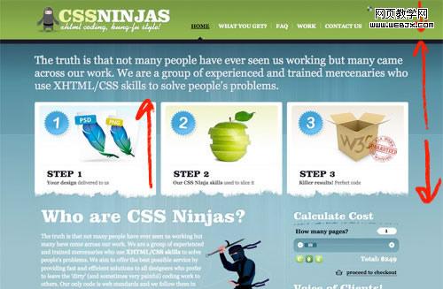一眼看去, CSS Ninjas 似乎使用的是平直顏色。不過其實每個色彩區域都有微弱的漸變,創造出迷人的材質效果。