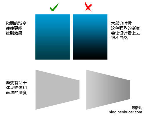 運用漸變的關鍵是不要做得太過了。在Photoshop裡繪制漸變時,請在圖層樣式裡做漸變疊加,這樣能保證你的漸變的可編輯性,而且隨著圖層的縮放,漸變也能跟著無損地縮放。