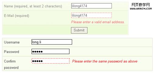 所以,上下左右並不像想象中有那麼大的關系,只要在發生地附近,用戶都是可以注意到的,只是程度不同而已。倒是怎樣清晰明確地表達反饋與對發生地之間的關聯、不讓用戶產生迷惑顯得更為關鍵,關於這一點,jQuery Validation 所提供的 Plugin Demo裡給出了一個比較好的思路,設計師們可以考慮通過一些樣式的改變來制造一些聯系。