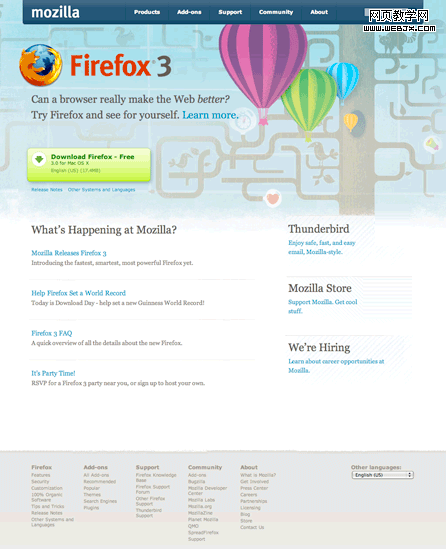 要是滿足客戶和老板每個強化某些功能的需求,頁面所有元素都會去搶著吸引用戶注意—結果就是都得不到注意。圖4和圖5,兩個互聯網浏覽器下載頁面。Firefox頁面,下載浏覽器號召很明顯,頁面其他元素—-Thunderbird、 Mozilla商店和最新內容—–沒有干擾。