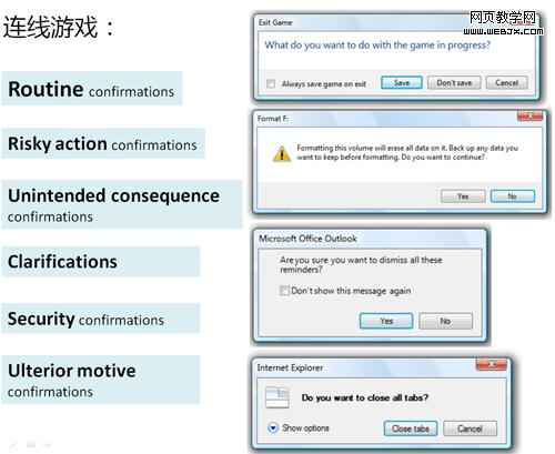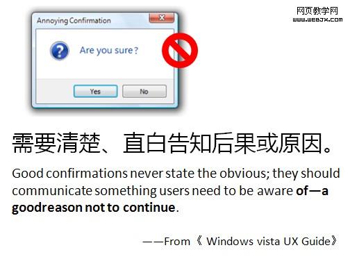 究竟有沒有一些原則和規范可以指導二次確認頁的用法的?所以一邊做項目,就一邊進行一些分析了。最近在研究《windows vista UX Guide》,發現它裡面的很多內容非常有營養,也對我之前純原創內容進行了一些補充。於是分享分享吧,將原來的ppt做了一些摘選如下。