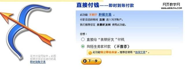 圖:在支付寶的直接付款頁面,點擊radio button後已經使用提示告知了後果,因此點擊下一步就不需要再次確認了。
